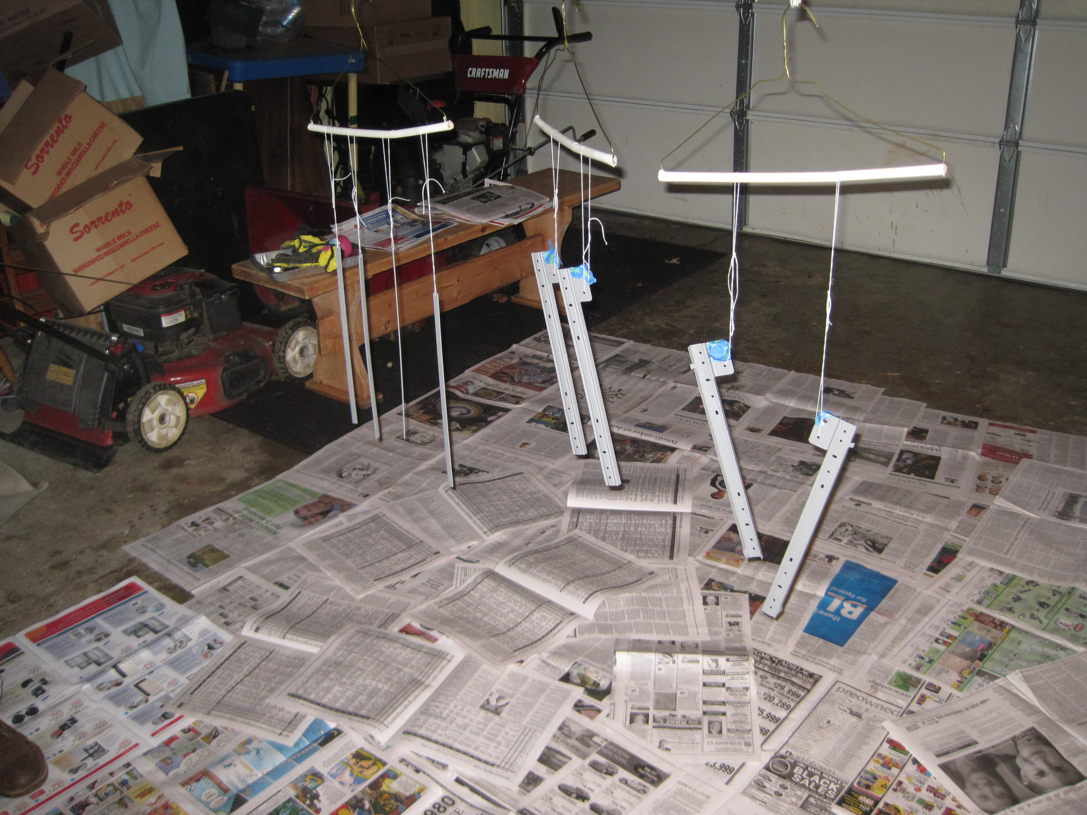 And that was the first thing we did. Took off the old, gold-plated hardware and gave it a new look. Because we were spray painting both sides, Dan came up with nifty contraptions to hang them from. Coat hangers and string, hung from my garage rafters. Not a bad idea, and it got the job done. A few layers of primer, a few more of black paint, topped off with satin poly, and the hardware was good to go.