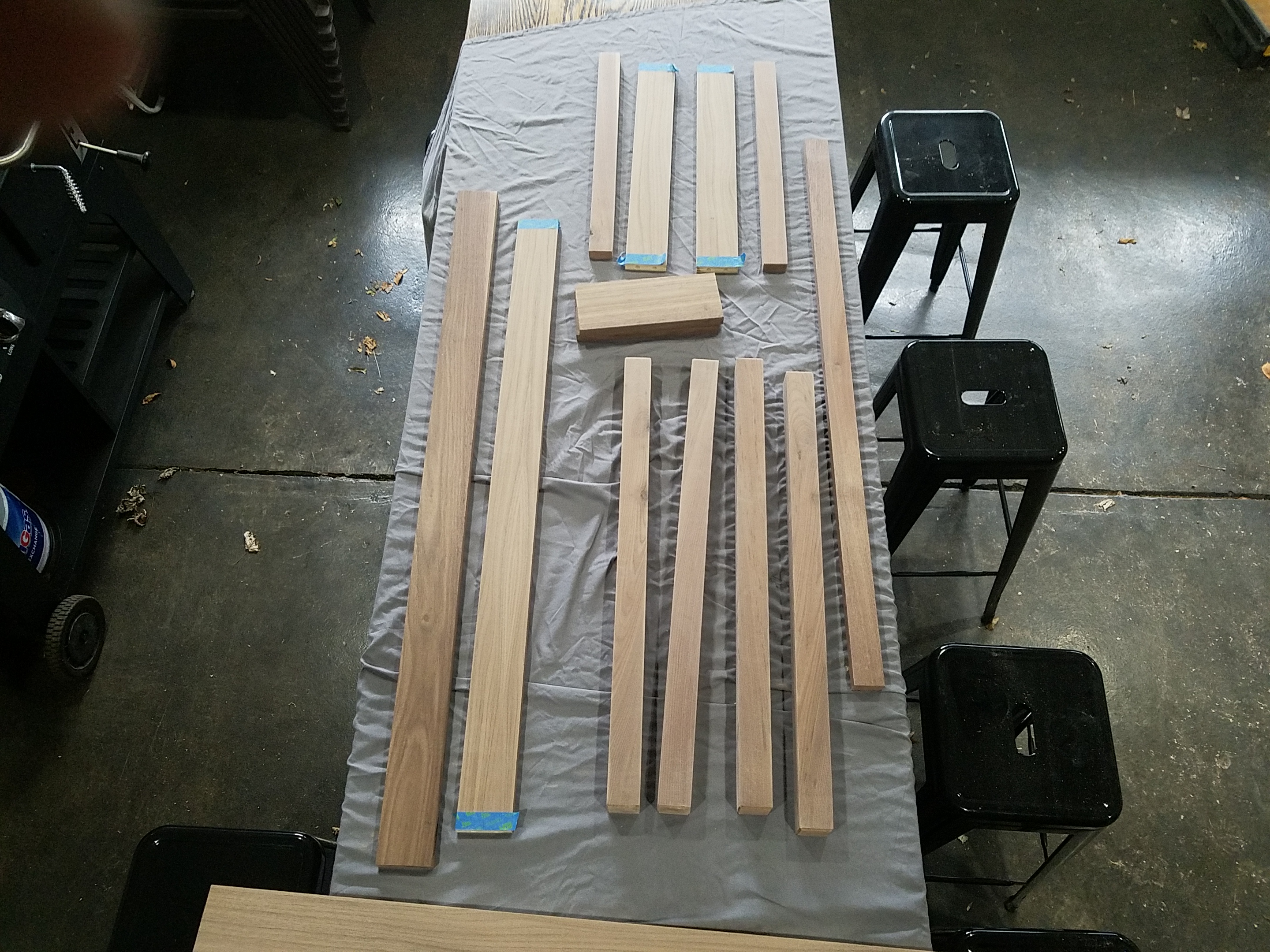 After a trip to his favorite lumber yard, the first step in this build was to simply cut all the pieces to size – walnut legs and plywood top finished in walnut veneer.